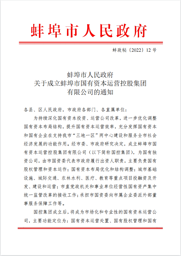 蚌埠市人民政府关于成立bwin必赢的通知