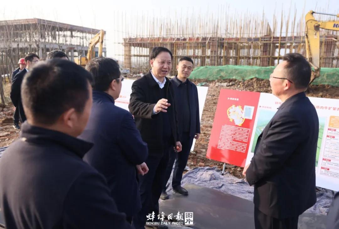 黄晓武书记现场察看施工进度,详细了解项目进度、规划设计等情况,陈建功董事长对项目建设和后期运营有关问题进行详细介绍。黄书记对该项目建设表示充分肯定,强调要进一步加快建设进度,优化运营模式,积极探索联农带农新模式,发展“智慧+生态”一体化肉牛养殖体系,要把乡村产业发展摆在更加突出位置,下更大功夫抓好“粮头食尾”“畜头肉尾”“农头工尾”增值大文章,充分发挥蚌埠优势,深入实施“秸秆变肉”暨肉牛振兴计划,加强高品质肉牛繁、育、加全产业链建设,加快肉牛产业转型升级,为乡村振兴提供有力产业支撑。