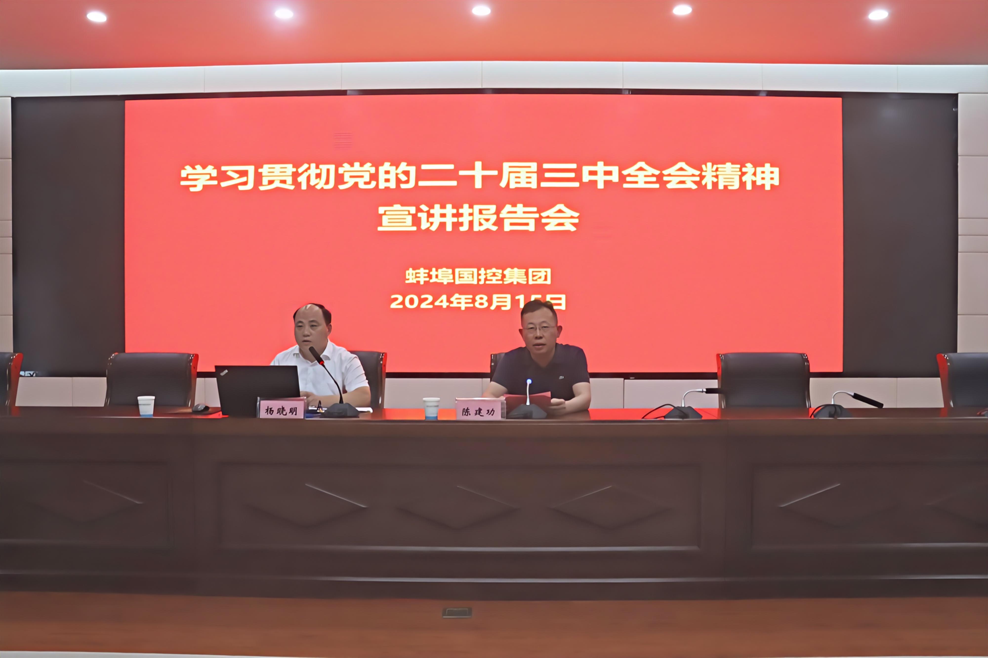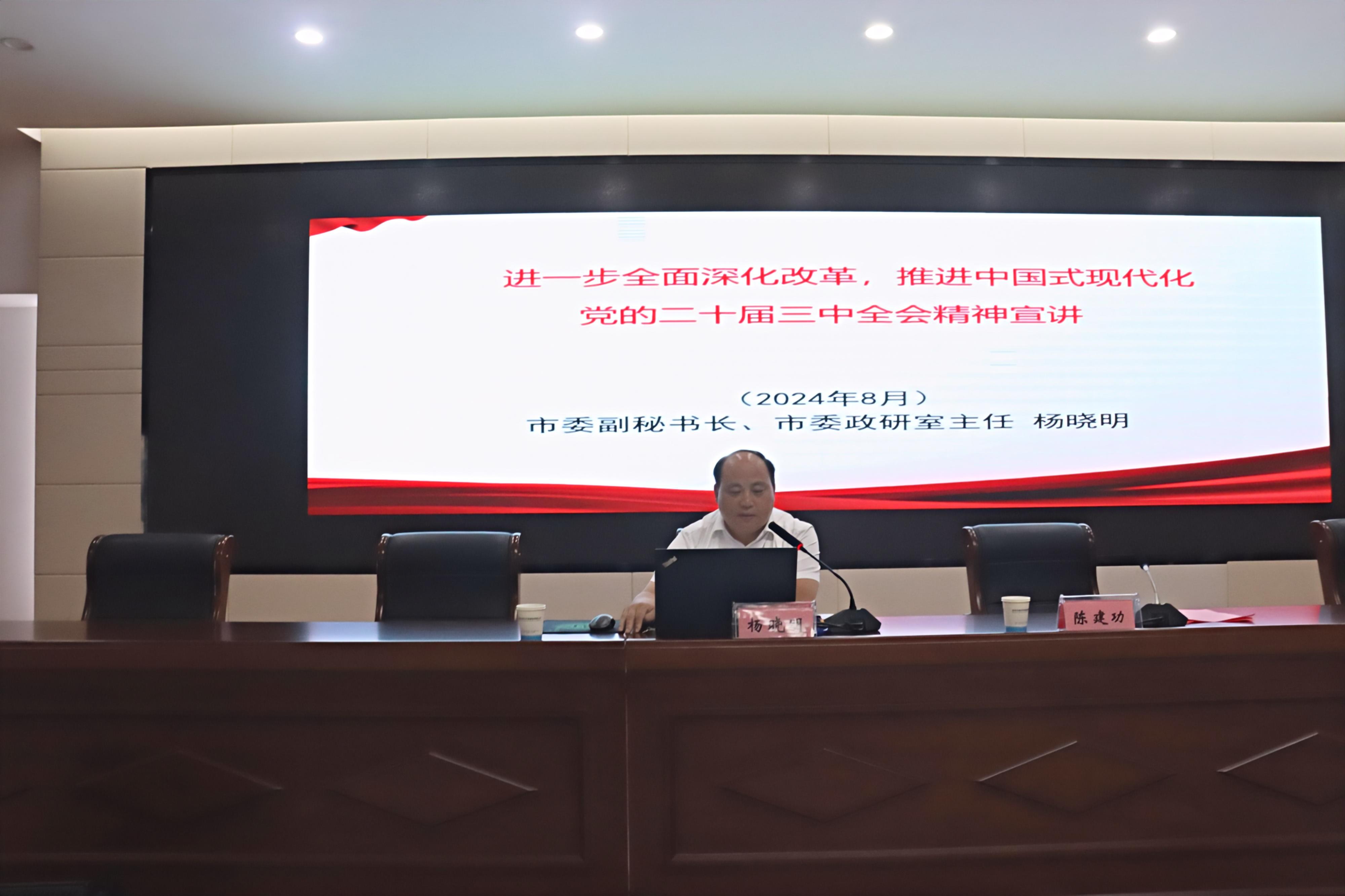 为认真学习宣传贯彻党的二十届三中全会精神,推动落实国有企业改革发展新任务新要求,8月15日下午,市bwin必赢集团举办学习贯彻党的二十届三中全会精神宣讲报告会,会议邀请市委副秘书长、市委政研室主任杨晓明作主题宣讲,集团党委书记、董事长陈建功主持会议并讲话。集团领导班子成员、部门负责人,所属子公司领导班子成员和基层党组织书记代表共计88人参加会议。