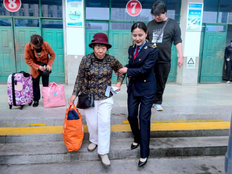 在熙攘的站区,有一群始终在一线岗位上默默坚守的劳动者。在笔者按下相机快门的瞬间,一位站务员正搀扶着步履蹒跚的老人乘车,这名交通服务人员身姿挺拔,制服整洁,眼神专注且充满关切,她的动作轻柔,传递着温情与关怀,仿佛在告诉老人不必担忧。行动不便的老人因为工作人员的陪伴而多了几分安心,缓缓走出的每一步都像是在诉说着“有你,我放心”。
