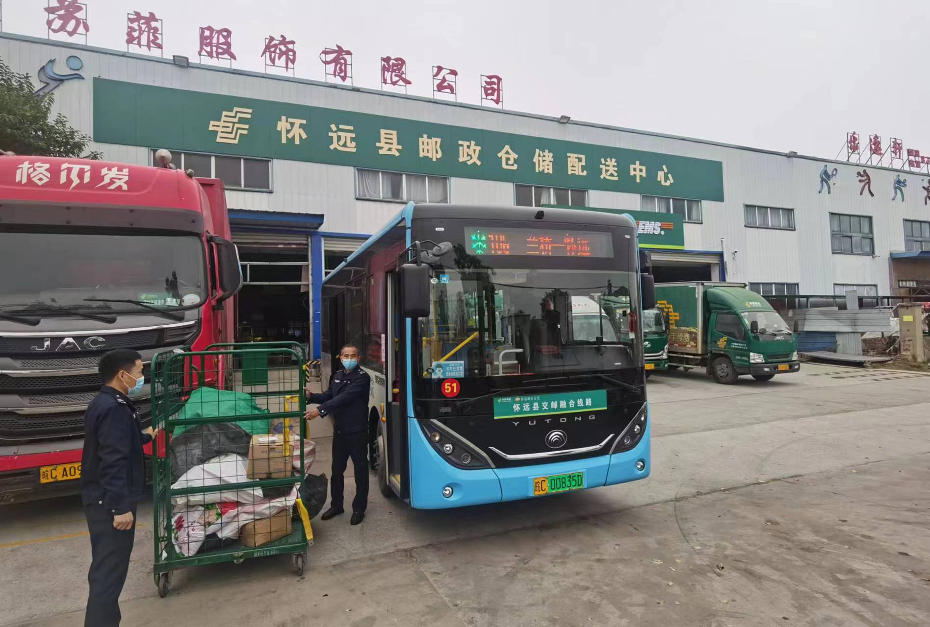 怀远城乡公交“交邮融合”项目,即利用四通八达城乡公交网络,在客流低谷时段利用车辆富余装载空间,将邮政快递交由城乡公交车辆代运代投。该项目有效降低了邮政企业人员和运输成本,增加了农村客运车辆效益,弥补了乡村物流短板,同时实现农村客运稳健发展,是“一点多能、一网多用、功能集约、便利高效”的农村运输服务发展新模式。目前,怀远城乡公交公司与中国邮政集团怀远分公司合作,已开通“交邮融合”线路3条,建立兰桥、龙亢农场寄递共配中心2座,承揽了兰桥、魏庄、徐圩、龙亢等4个乡镇以及农垦集团龙亢农场场区的邮政快递运输业务,日均运输快递约2600件,每年通过公交车辆代运快递95万件。